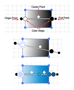 Furthermore, different fills may blend into one another in various ways. The figure "Multiple Fills with Blending" shows the left rectangle with a solid fill, the middle rectangle with a pattern fill, and the right rectangle with both fills. Note that the orange of the pattern fill is blending into the blue of the solid fill.