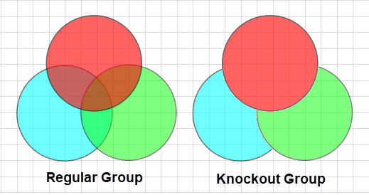 The term knockout derives from the nomenclature of color separation printing in which an object that is to be printed on top of another object of a different color, removes or "knocks out" the color in the overlapping area of the object beneath it. If the color in the overlapping area of the lower object were not removed, the different colored inks would blend in the process as layers of colors are added. In the group on the left, the 50% opaque yellow of the circle blends with the blue of the square. In the knockout group on the right, the circle "knocks a hole out of the square, and because of the 50% opacity, you can see the background through it.