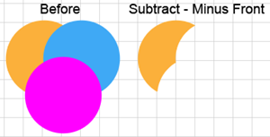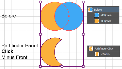 Example of clicking the Pathfinder panel Minus Front button, which yields a simple path that replaces and destroys the original overlapping paths.
