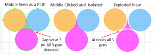 How the Shaper Builder Gap Detection Option works. The example shows that with the Gap Detection length set to 3 px, in spite of the gaps, Shape Builder analyzes the area between the 3 circles as a Face. As shown in the Exploded view, if you click the area, Ai isolates the central Face and adds the necessary lines to close its gaps.