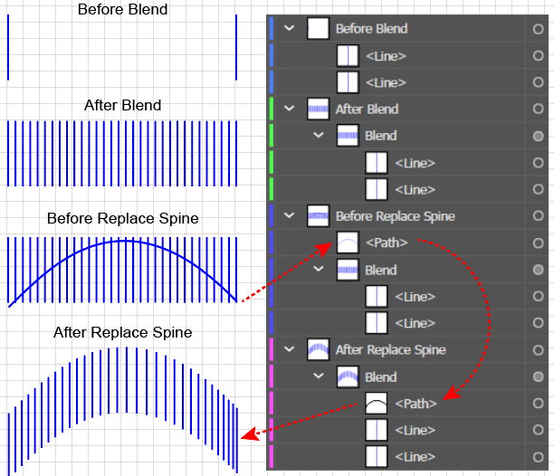 The Object > Blend > Replace Spine command works even with a Blend that is made up of open paths. As shown in the After Blend section of the accompanying figure, when you first create a Blend from open paths, Ai does not create a spine. However, as shown in the next two sections of the figure, if you create an open path for a "replacement spine," place it above an open-path Blend Object and then execute the Object > Blend > Replace Spine command, Ai will insert the path into the Blend Object as a Spine.